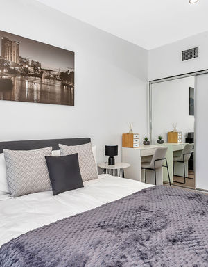 Step inside to an open plan living area that flows to a private balcony framing skyline views, while two restful bedrooms, a sleek bathroom, a full kitchen and an in-suite washer and dryer to make longer stays effortless.